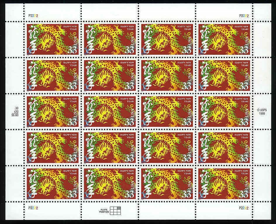Chinese New Year of the Dragon Sheet of Twenty 33 Cent Postage Stamps Scott 3370