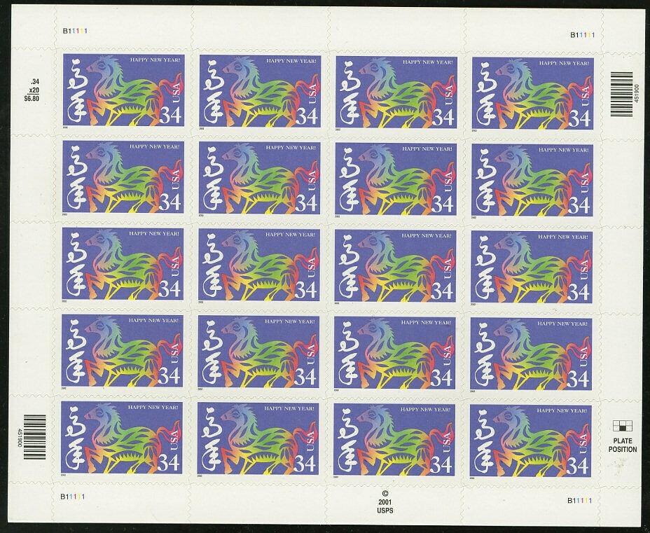 Chinese New Year of the Horse Sheet of Twenty 34 Cent Postage Stamps Scott 3559