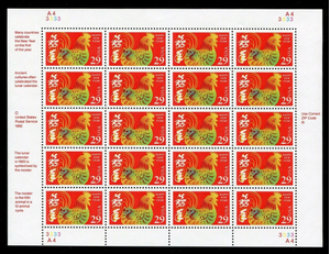 Chinese New Year of the Rooster Sheet of Twenty 29 Cent Stamps Scott 2720