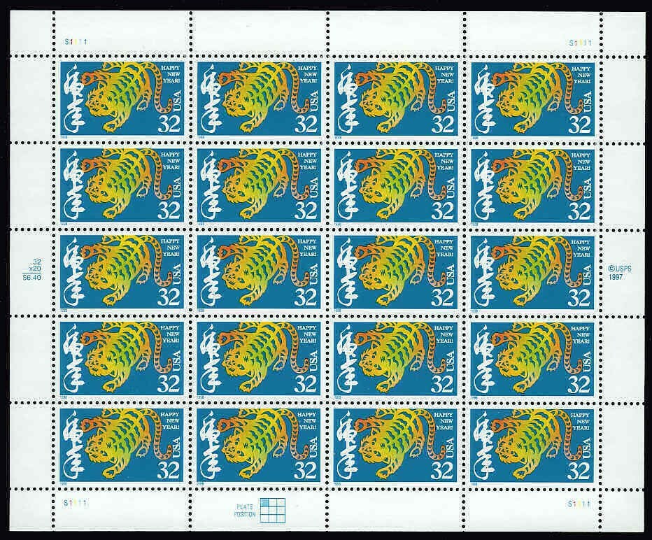 Chinese New Year of the Tiger Sheet of Twenty 32 Cent Postage Stamps Scott 3179