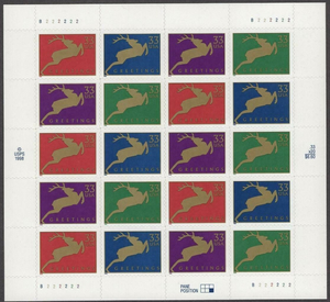 Christmas Reindeer Booklet Pane of Twenty 33 Cent Postage Stamps Scott 3356-59