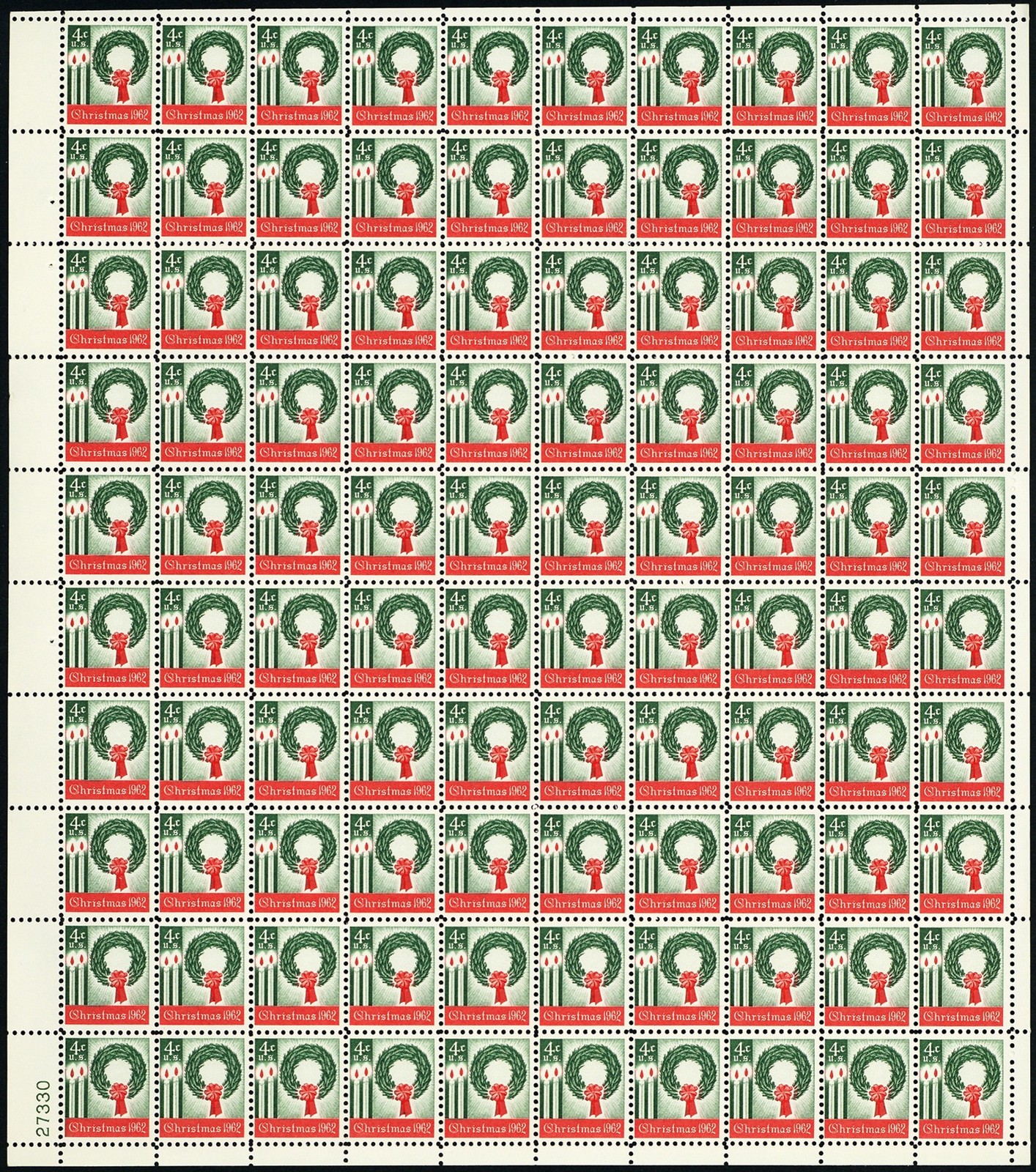 Christmas Wreath Sheet of One Hundred 4 Cent Postage Stamps Scott 1205