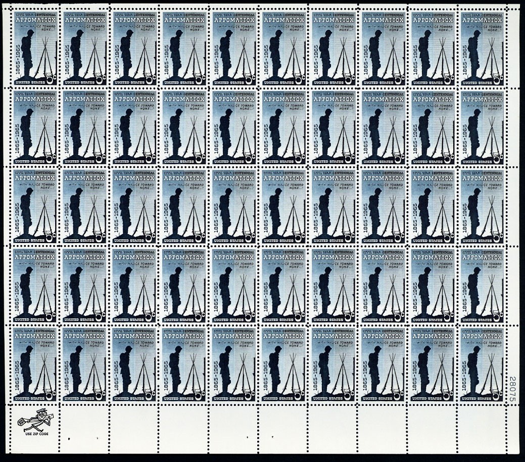 Civil War Appomattox Sheet of Fifty 5 Cent Postage Stamps Scott 1182