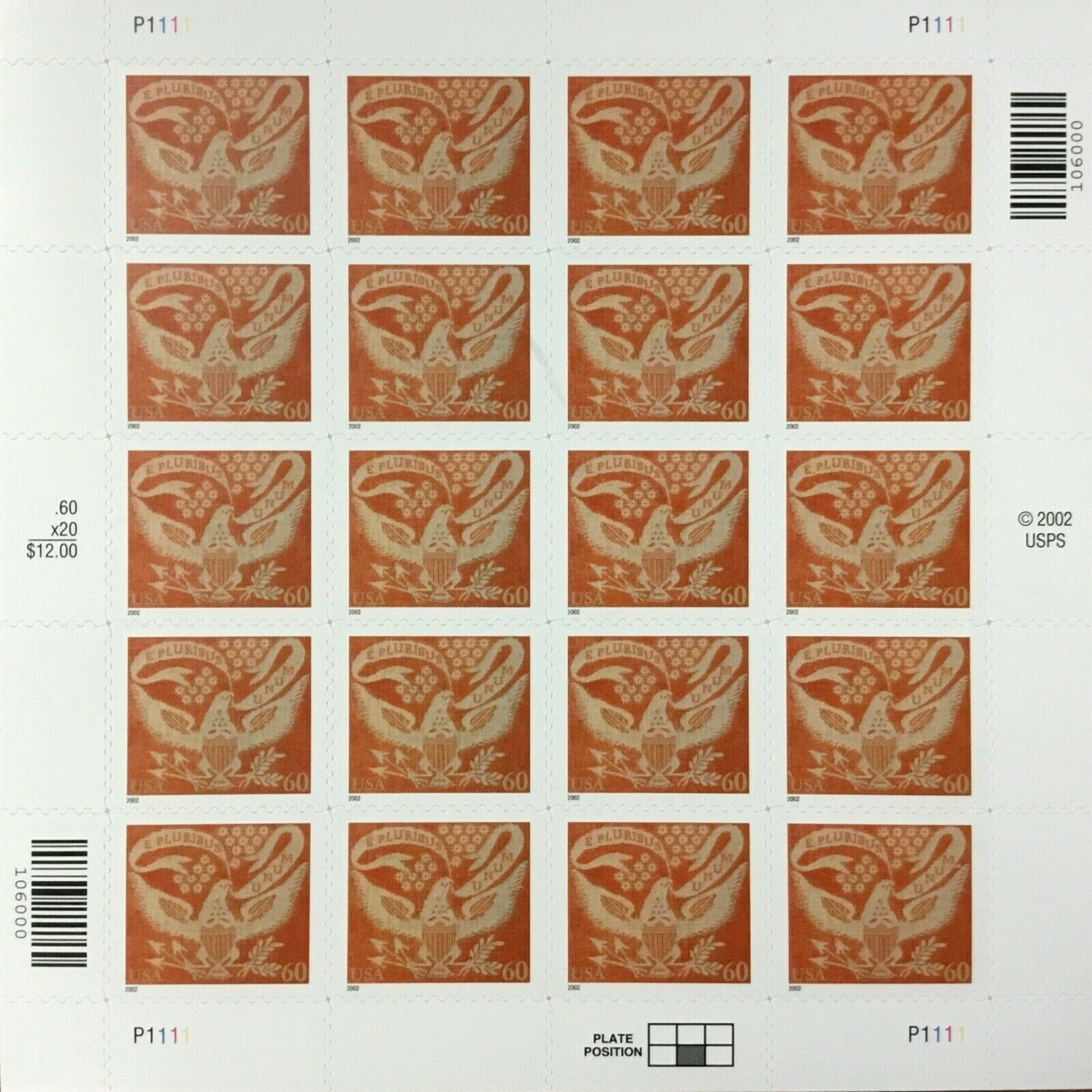 Coverlet Eagle Pane of Twenty 60 Cent Postage Stamps Scott 3646