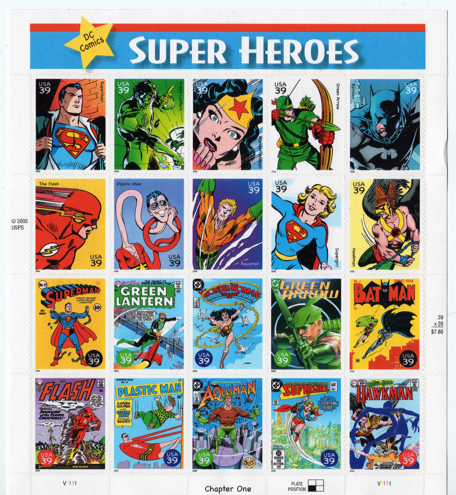 DC Comics Super Heroes Full Sheet of Twenty 39¢ Stamps Scott 4084 - Stuart Katz
