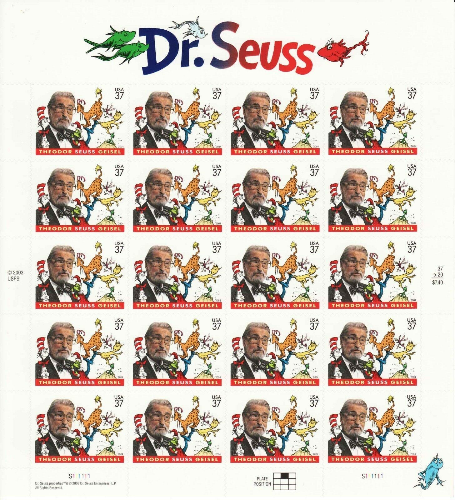 Dr. Seuss Sheet of Twenty 37 Cent Postage Stamps Scott 3835