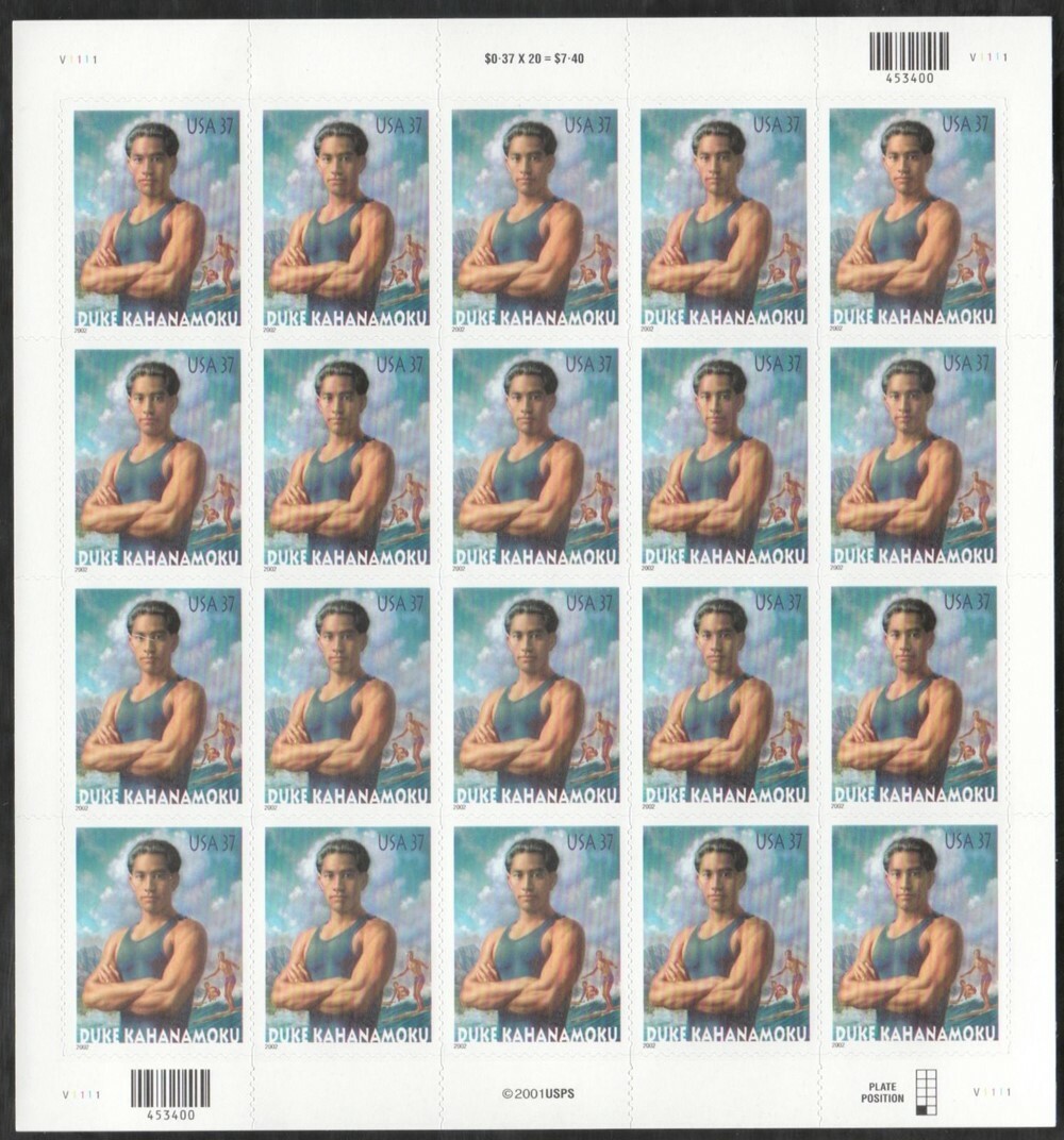 Duke Kahanamoku Surfing Sheet of Twenty 37 Cent Postage Stamps Scott 3660