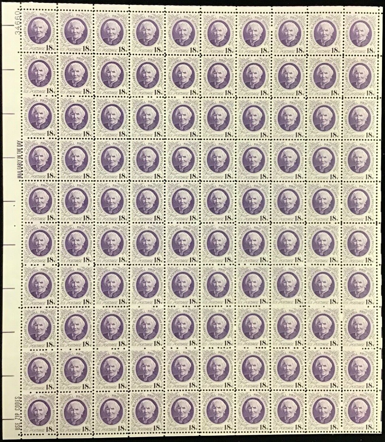 Elizabeth Blackwell Sheet of 100 - 18 Cent Postage Stamps Scott 1399