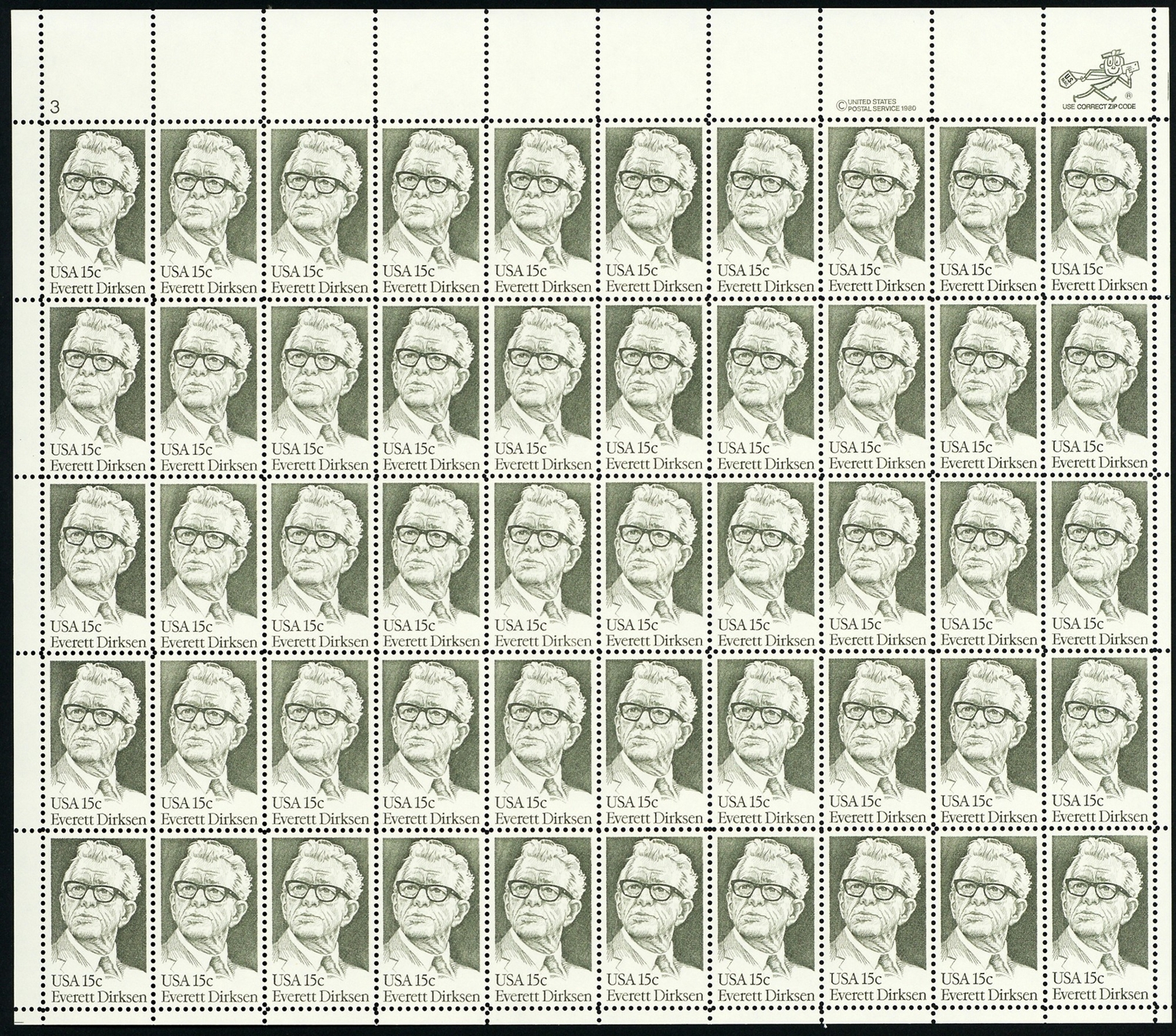 Everett Dirksen Sheet of Fifty 15 Cent Postage Stamps Scott 1874