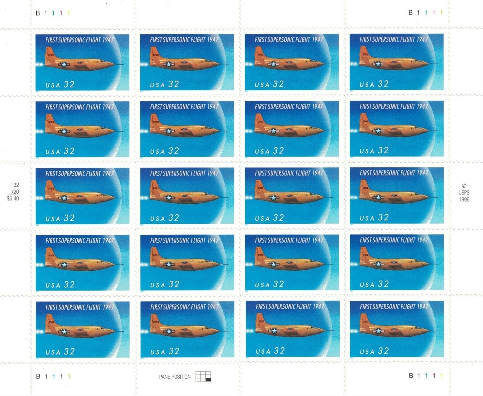 First Supersonic Flight Sheet of Twenty 32 Cent Postage Stamps Scott 3173