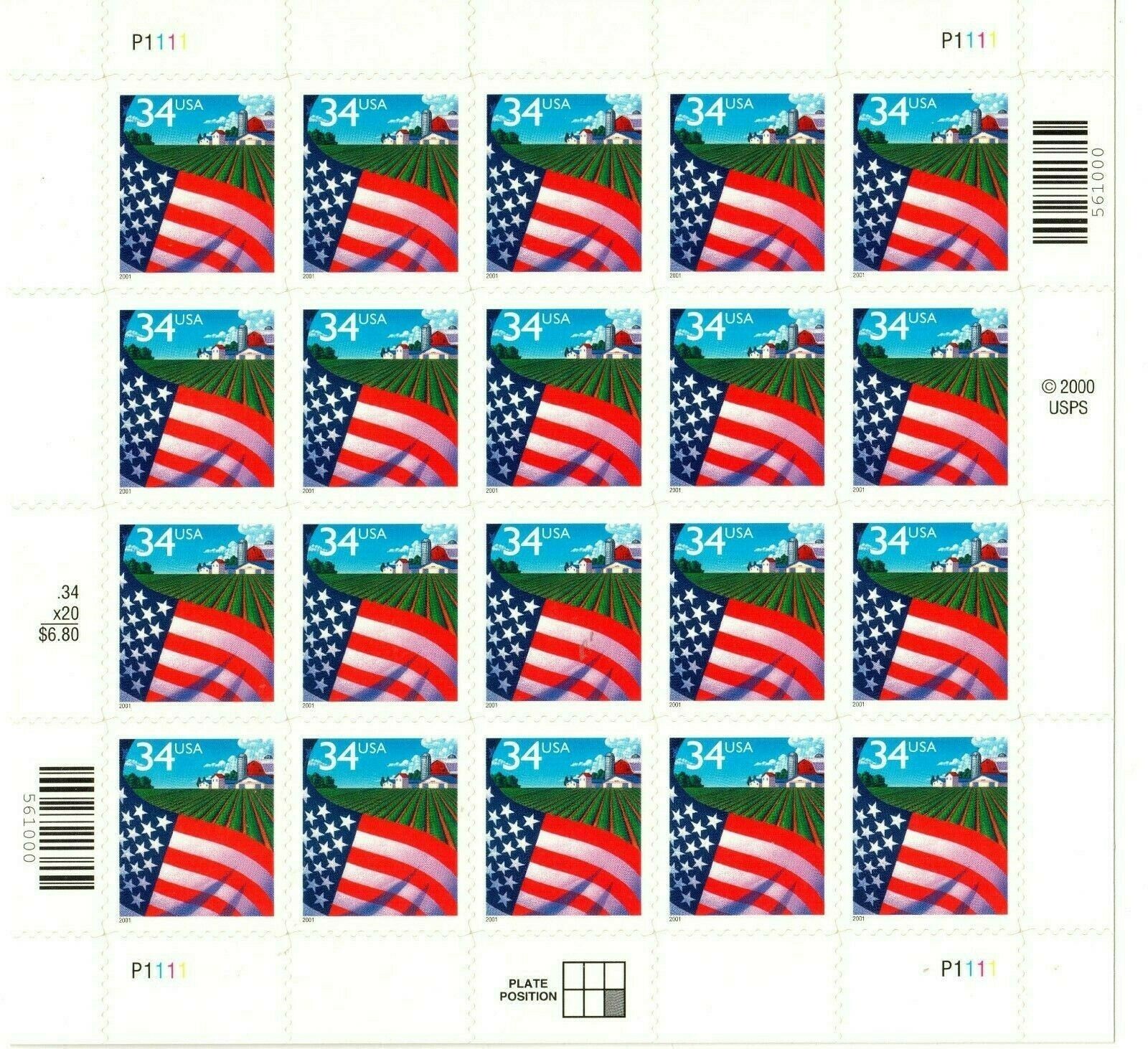 Flag Over Farm Sheet of Twenty 34 Cent Postage Stamps Scott 3470