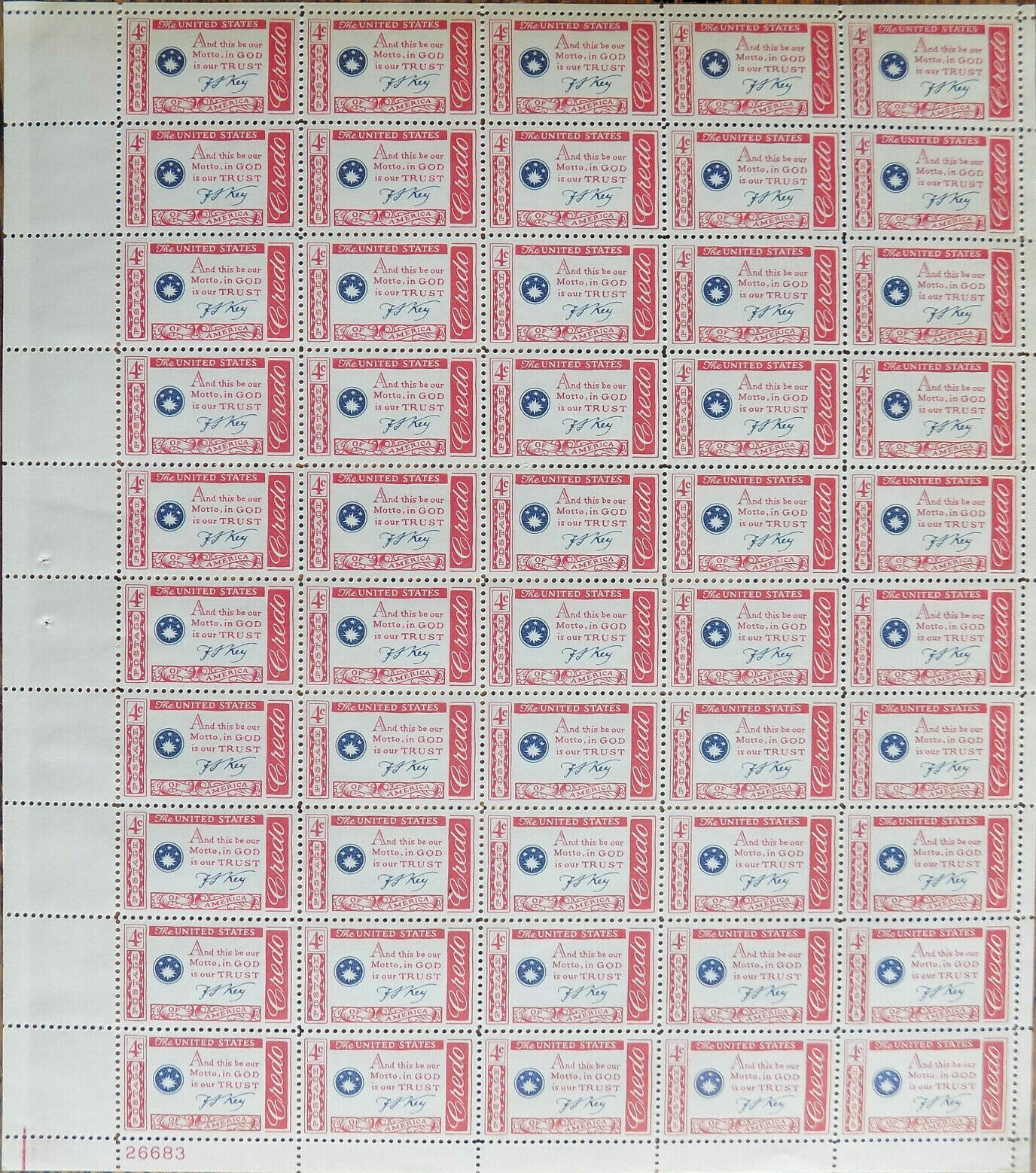 Francis S. Key American Credo Issue Sheet of Fifty 4 Cent Stamps Scott 1142