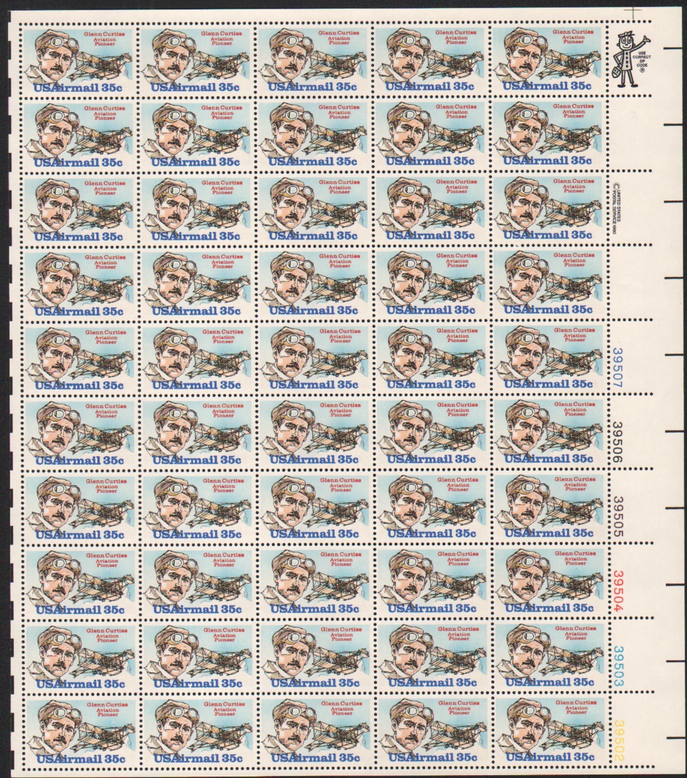Glenn Curtis Sheet of Fifty 35 Cent Airmail Postage Stamps C100