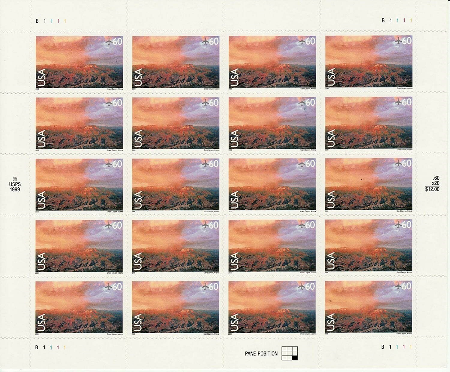Grand Canyon Sheet of Twenty 60 Cent Airmail Postage Stamps Scott C135