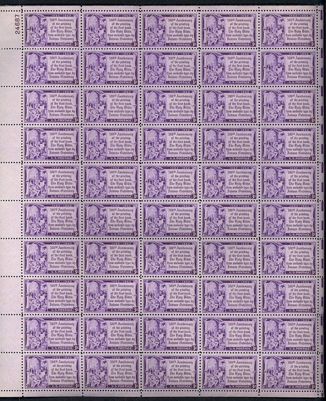 Gutenberg Bible Sheet of Fifty 3 Cent Postage Stamps Scott 1014