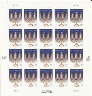 Hanukkah Menorah Twenty Sheet of Twenty 44 Cent Postage Stamps Scott 4433
