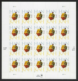 Hanukkah Twenty Sheet of Twenty 41 Cent Postage Stamps Scott 4219