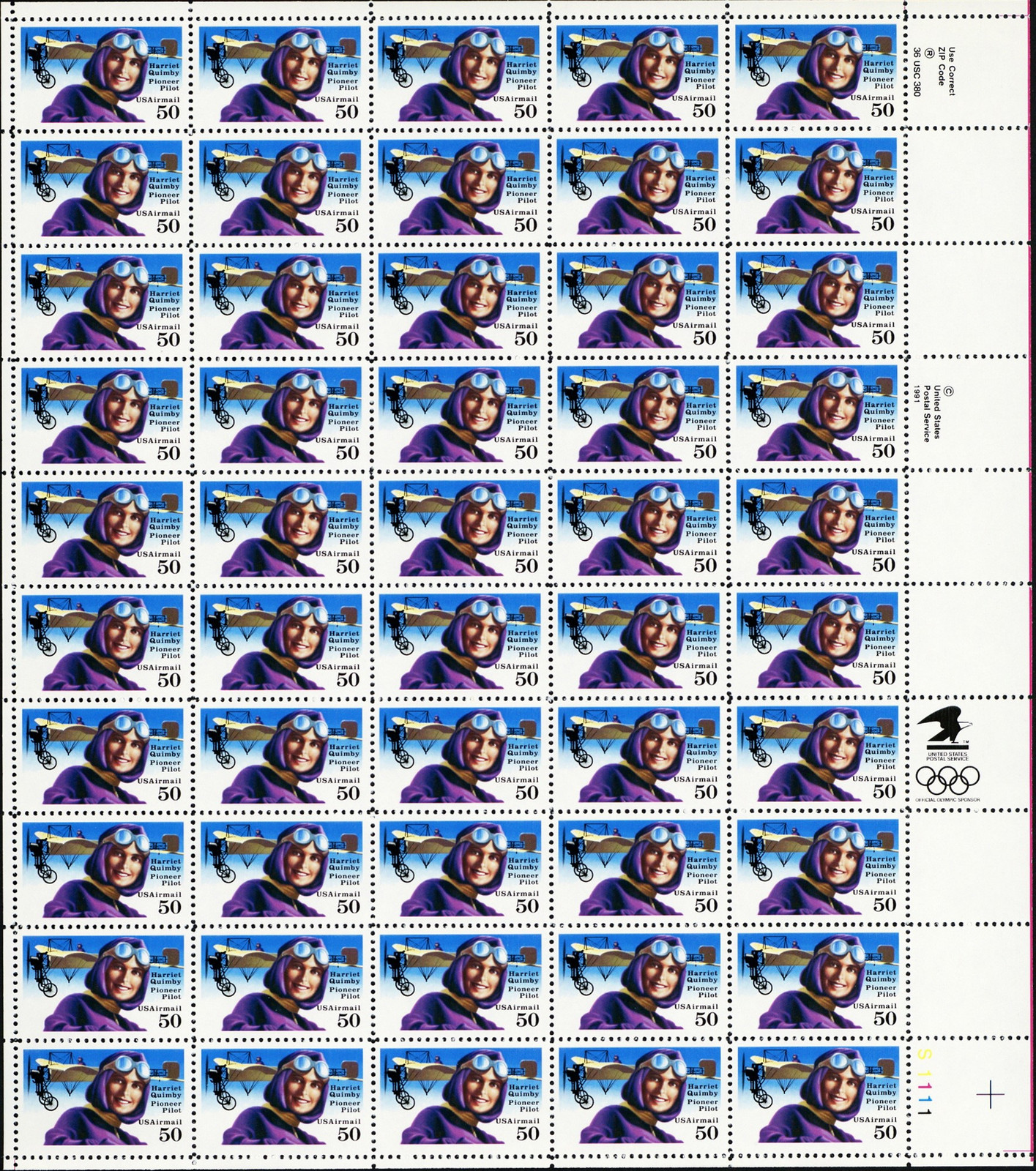 Harriet Quimby Complete Sheet of Fifty 50 Cent Airmail Stamps Coast Scott C128
