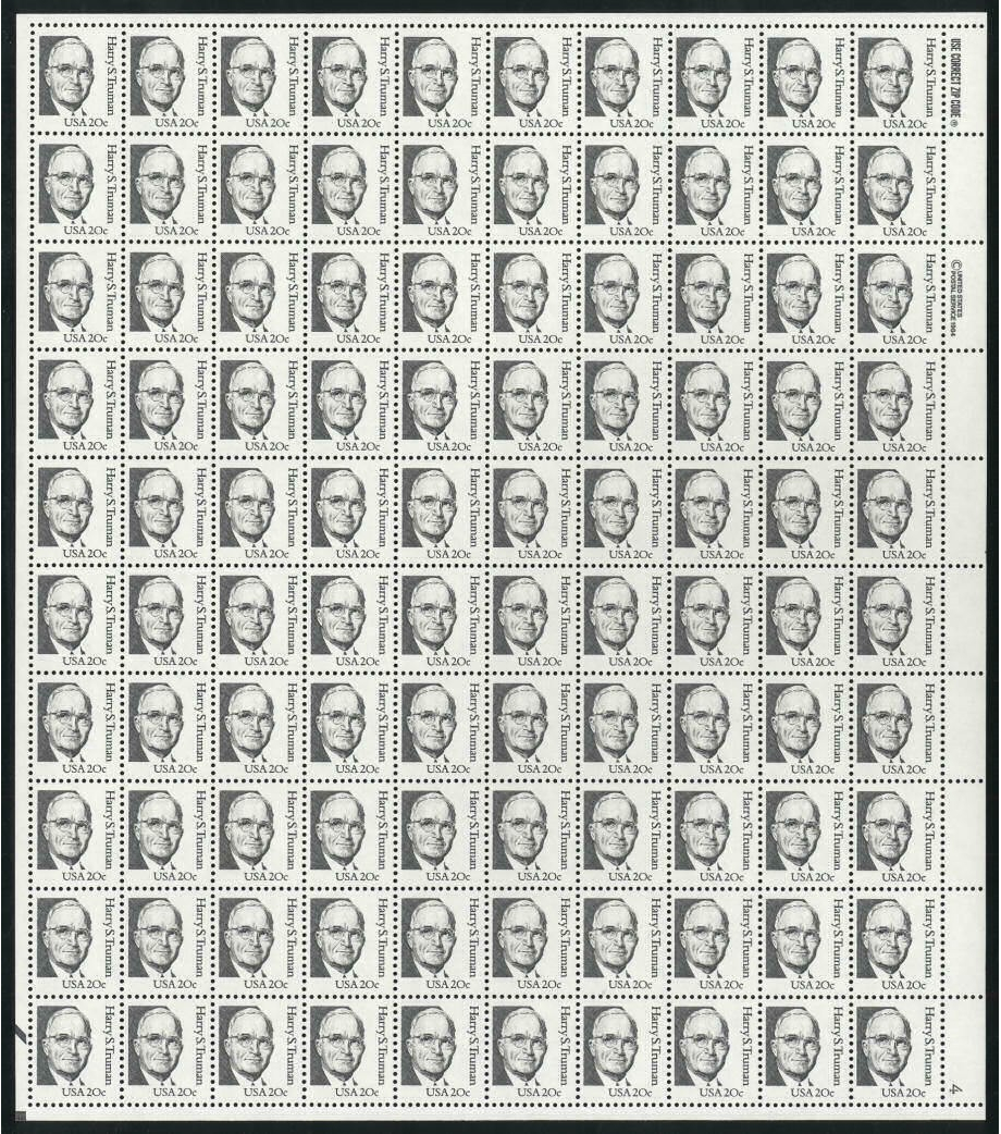 Harry Truman President Sheet of One Hundred 20 Cent Postage Stamp Scott 1862