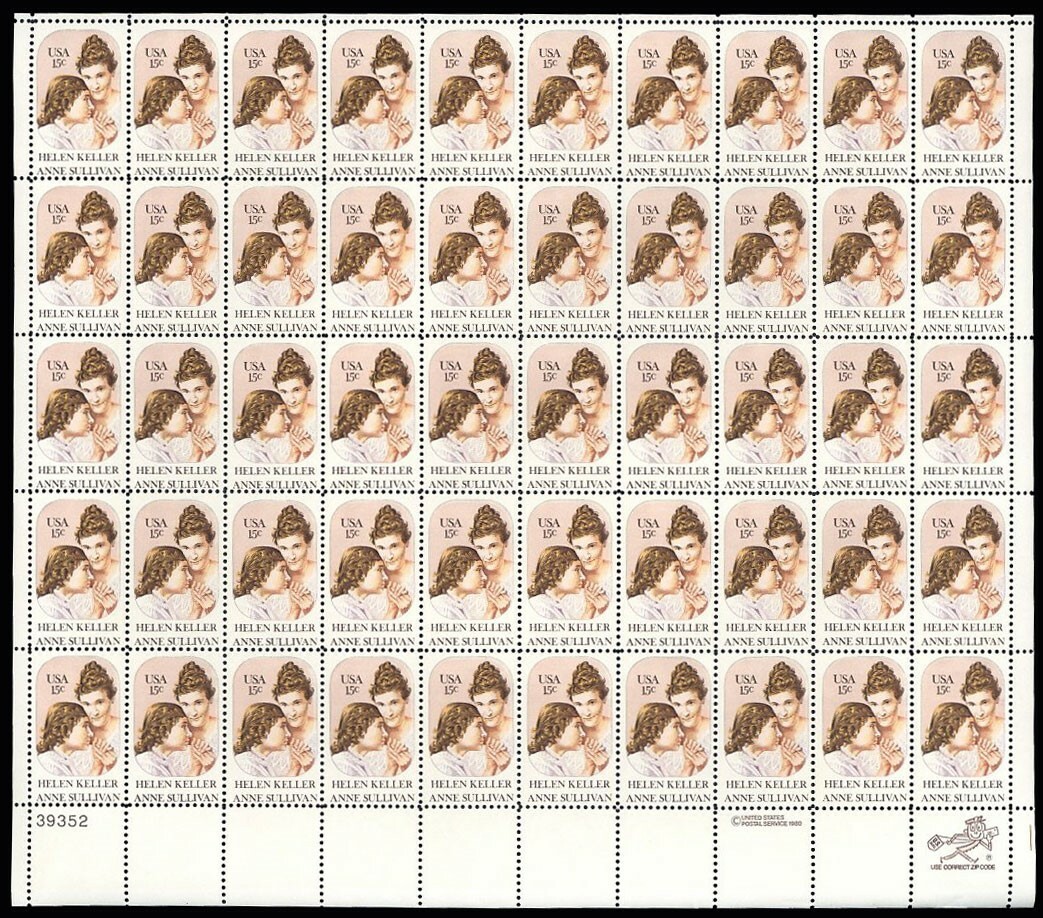 Helen Keller and Anne Sullivan Sheet of Twenty 15 Cent Postage Stamps Scott 1824