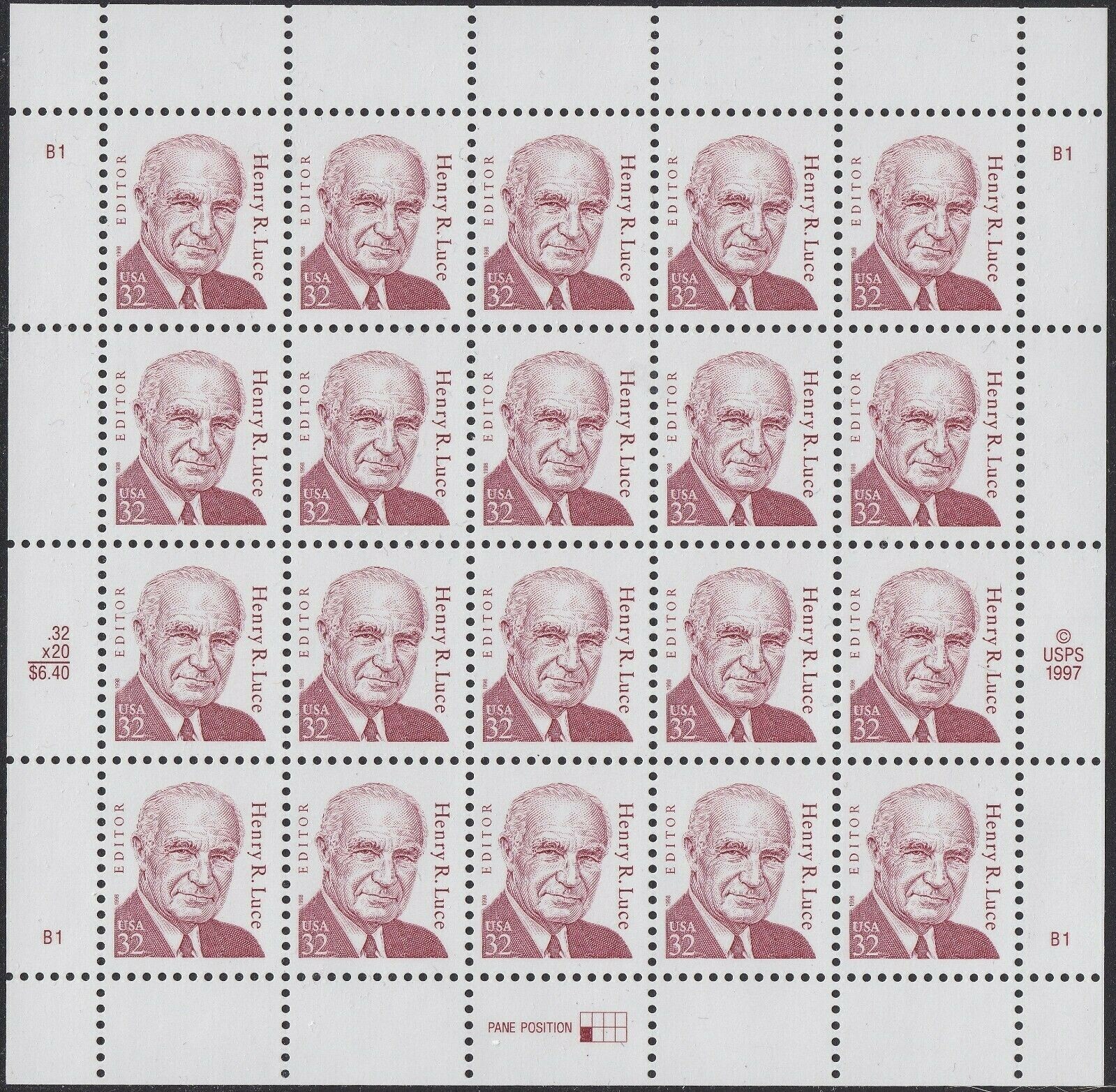 Henry R. Luce Sheet of Twenty 32 Cent Postage Stamps Scott 2935
