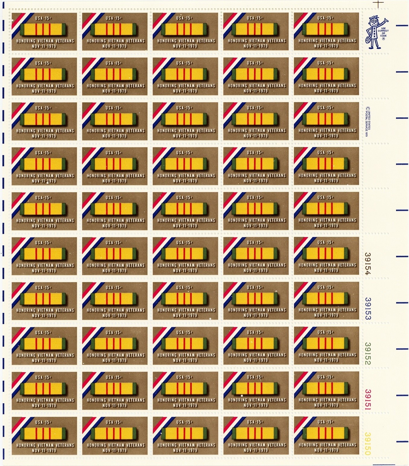 Honoring Vietnam Veterans Sheet of Fifty 15 Cent Postage Stamps Scott 1802