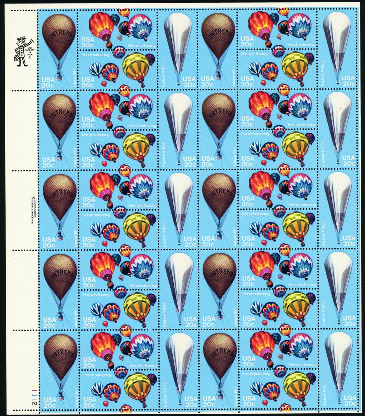 Hot Air Balloons Full Sheet of Forty 20 Cent Postage Stamps Scott 2032-35