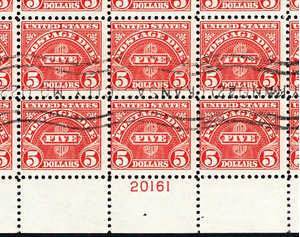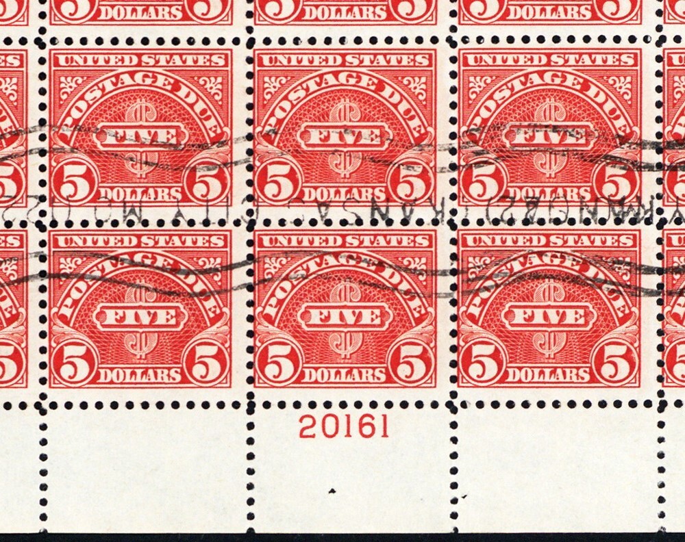 J78, Used Sheet of 100 $5 Postage Due Stamps RARE! - Stuart Katz