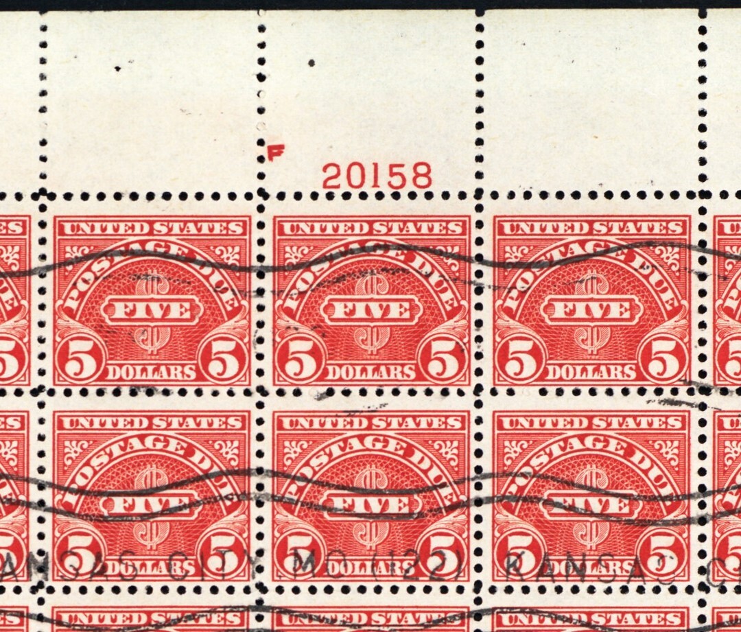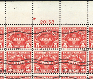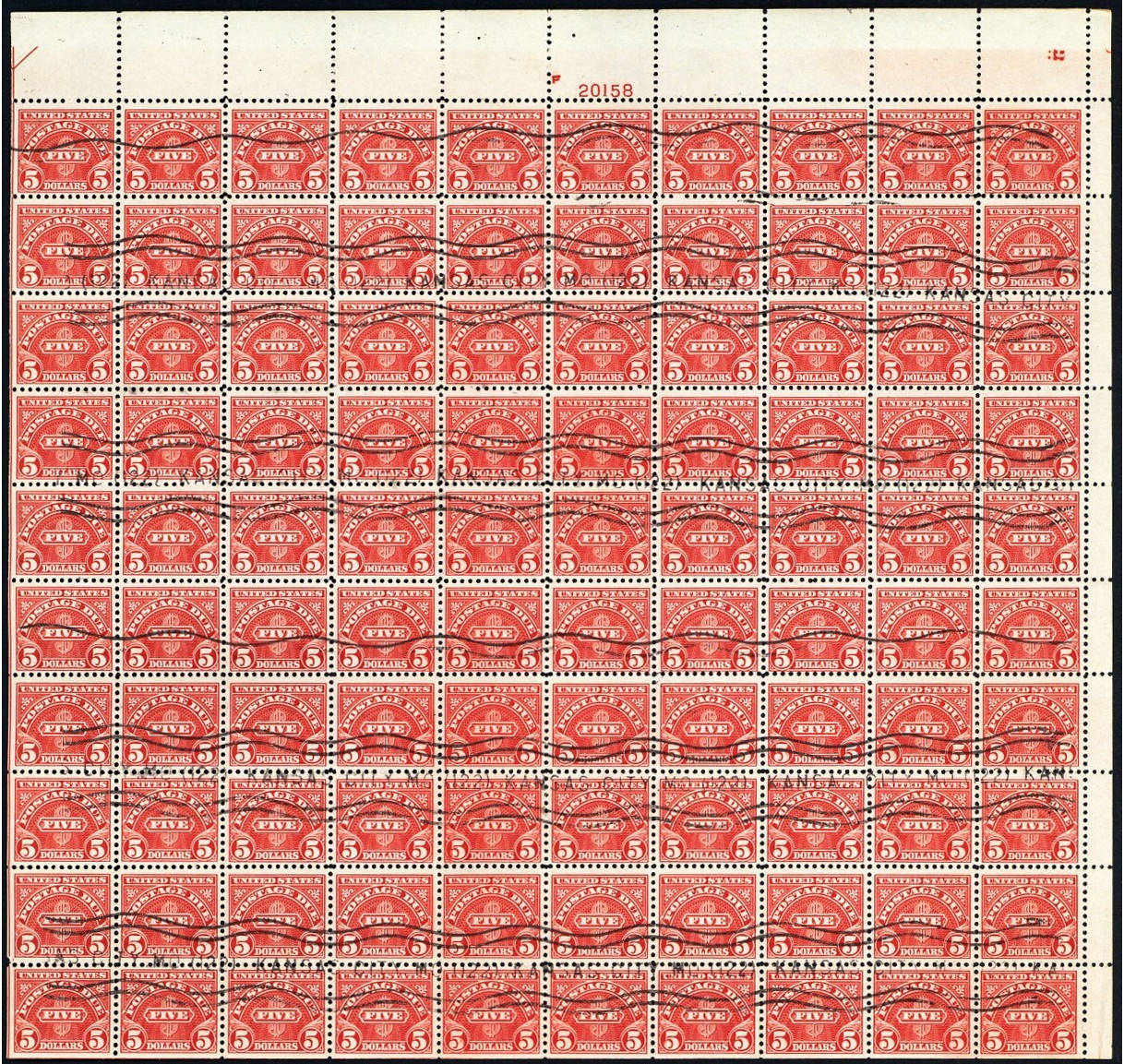 J78, Used Sheet of 100 $5 Postage Due Stamps RARE! --- Stuart Katz