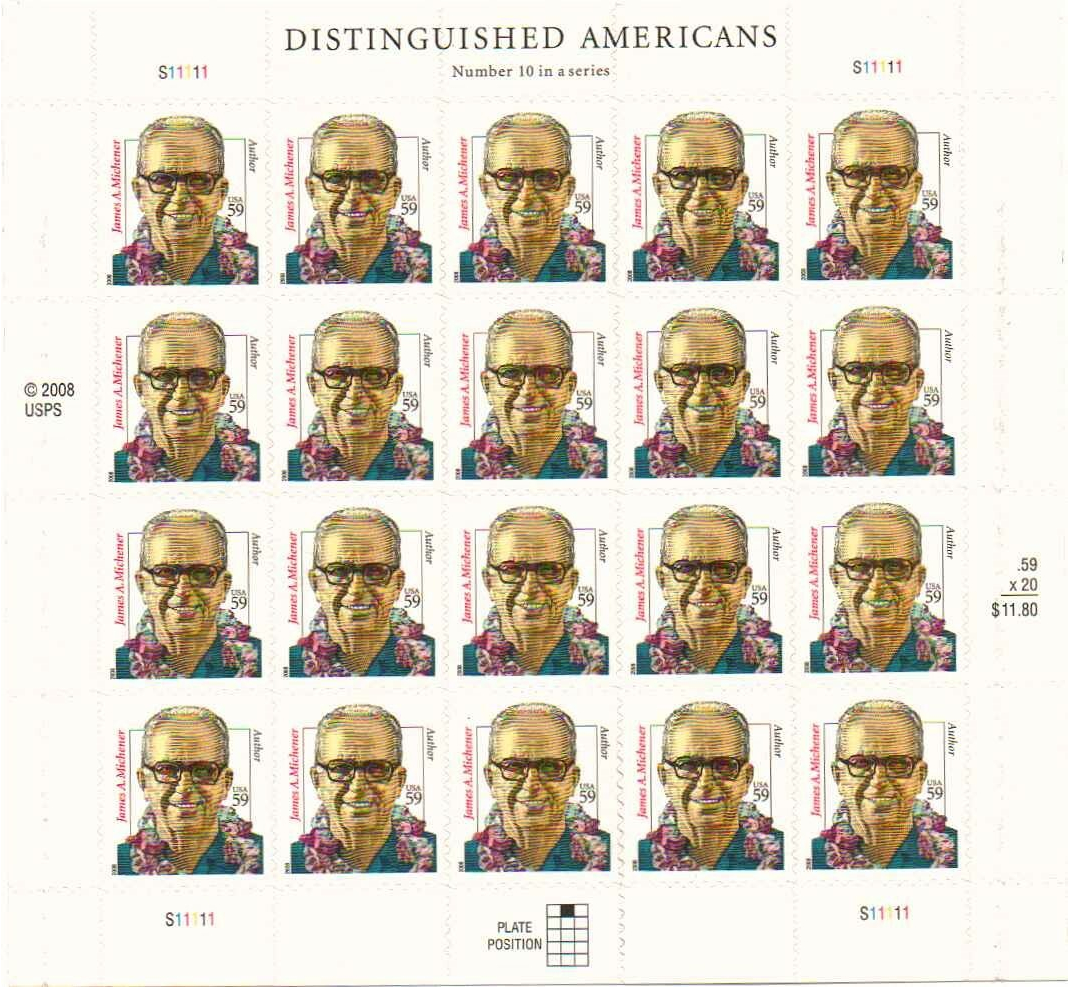 James A. Michener Sheet of Twenty 59 Cent Postage Stamps Scott 3427a