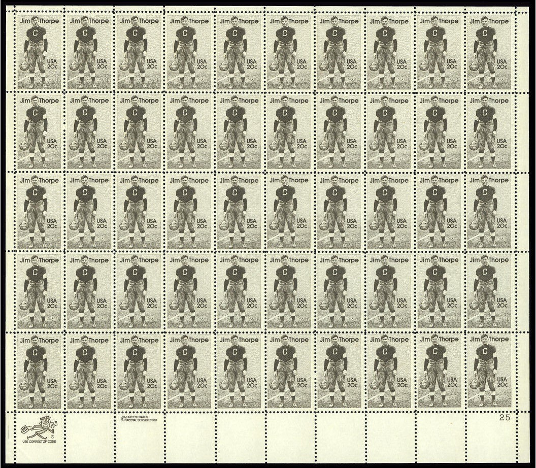 Jim Thorpe Sheet of Fifty 20 Cent Postage Stamps Scott 2089