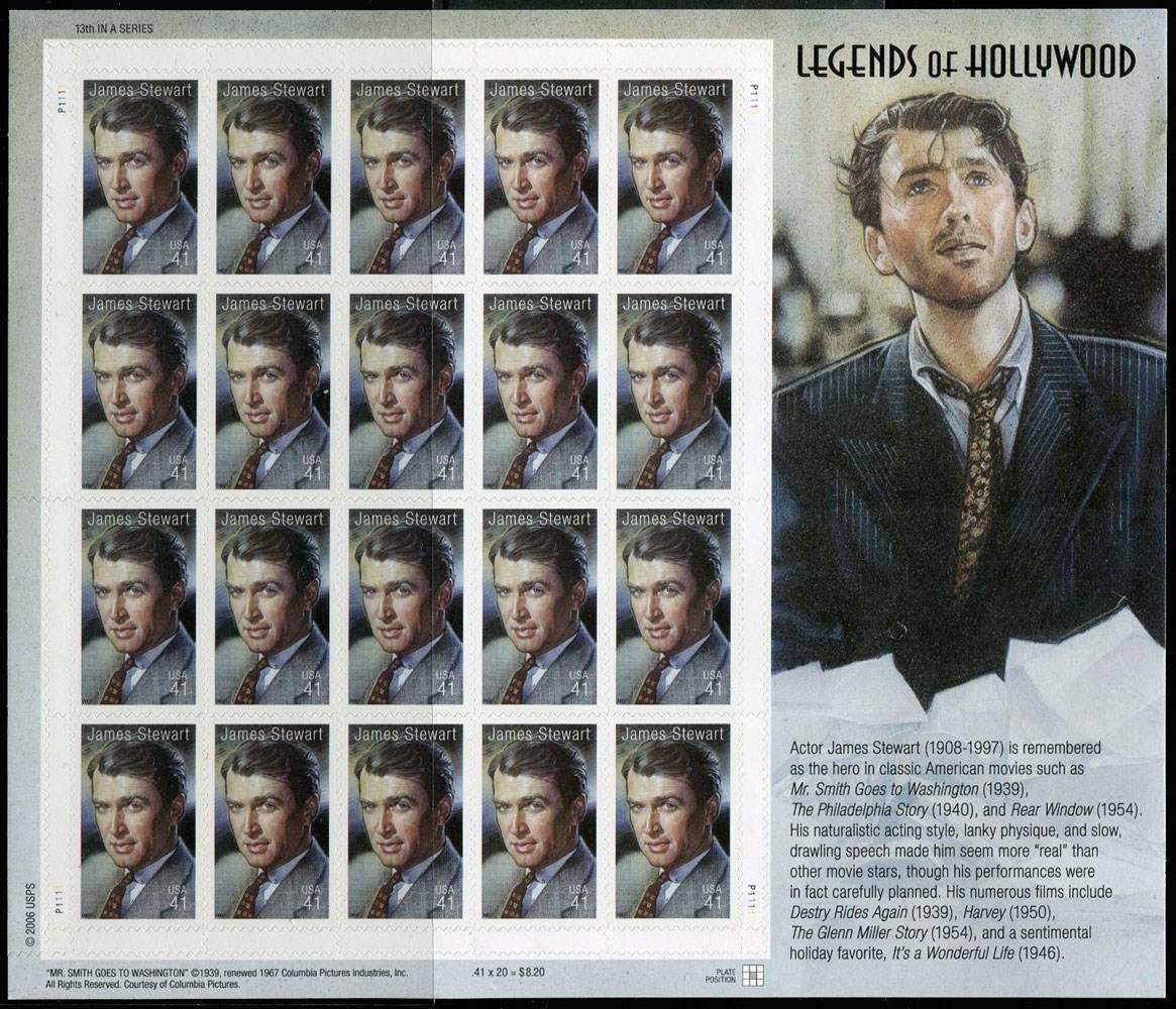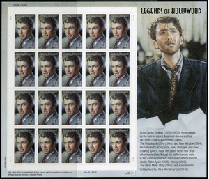 Jimmy Stewart Legends of Hollywood Sheet Of 20 Stamps 41 Cent Stamps Scott 4197
