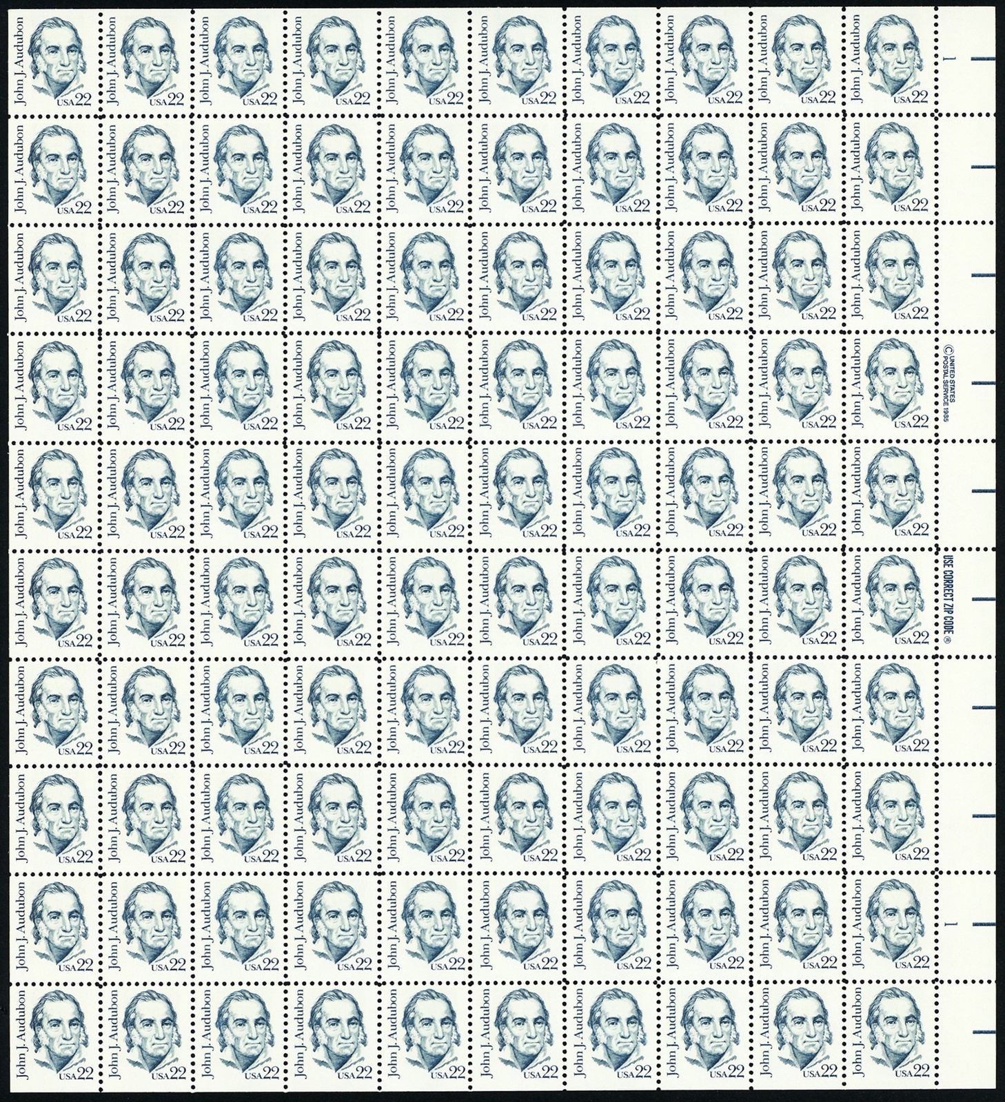 John James Audubon Sheet of One Hundred 22 Cent Postage Stamps Scott 1863