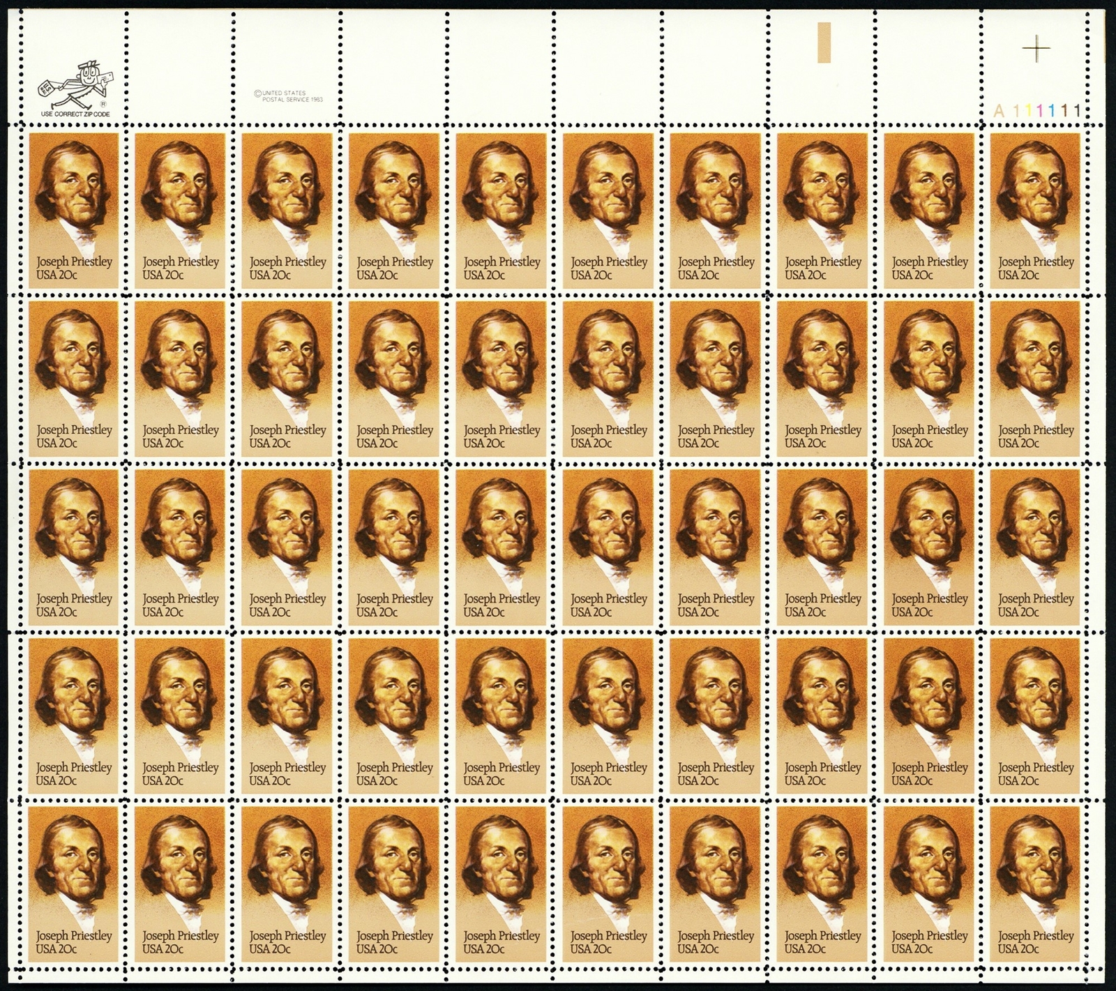 Joseph Priestley Chemist Sheet of Fifty 20 Cent Postage Stamps Scott 2038