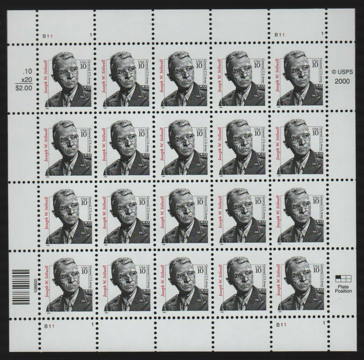 Joseph Warren Stilwell Sheet of Twenty 10 Cent Postage Stamps Scott 3420