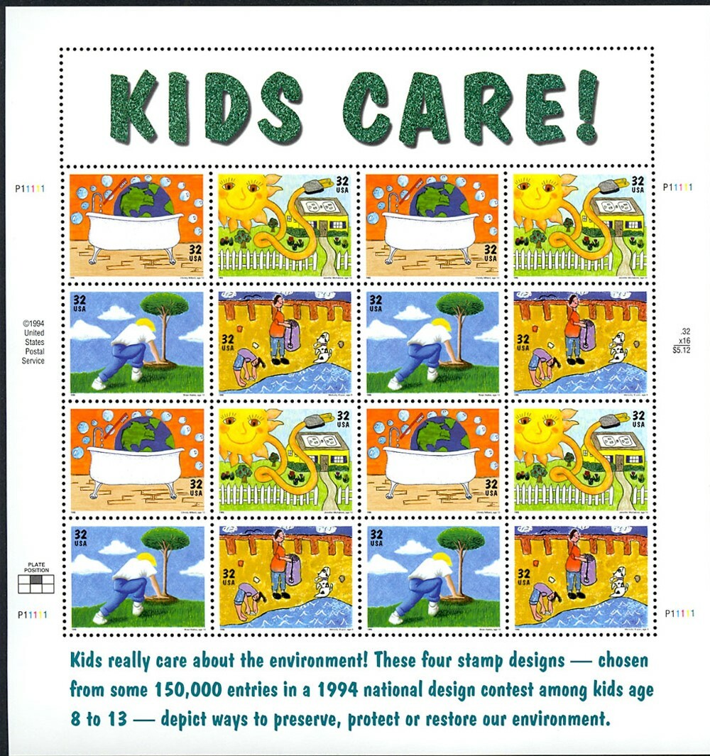 Kids Care - Earth Day Full Sheet of Sixteen 32 Cent Postage Stamps Scott 2951-54