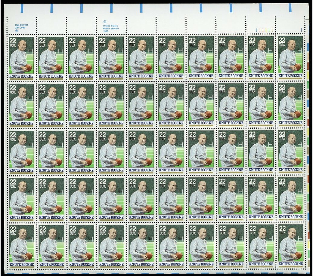 Knute Rockne Football Coach Sheet of Twenty 22 Cent Postage Stamps Scott 2376