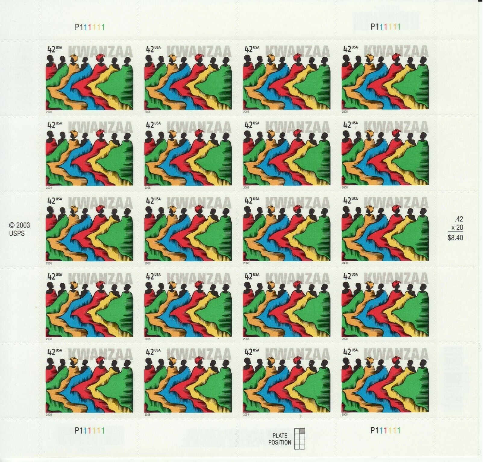 Kwanzaa Celebration Sheet of Twenty 42 Cent Postage Stamps Scott 4373
