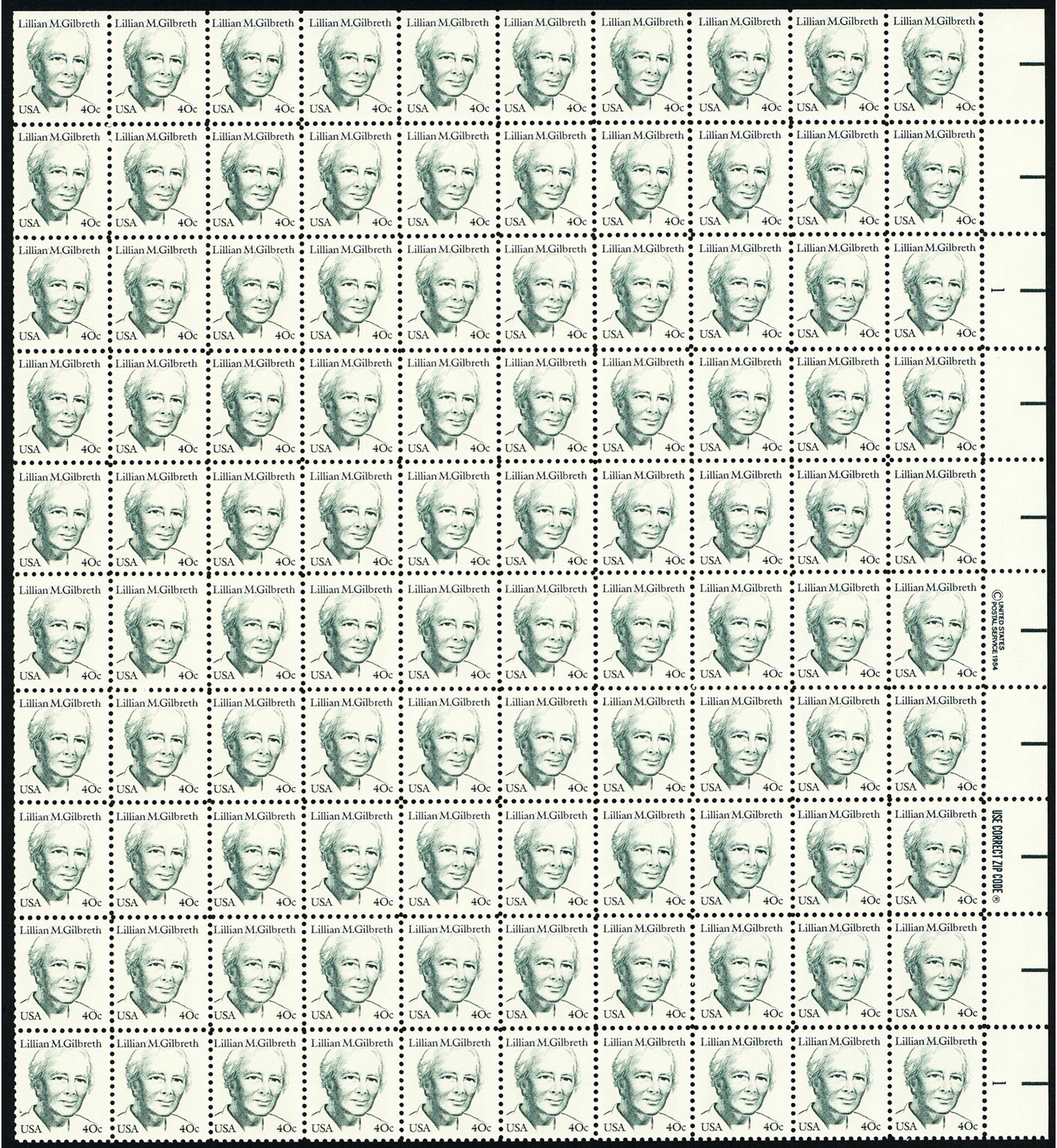 Lillian Gilbreth Sheet of One Hundred 40 Cent Postage Stamps Scott 1868