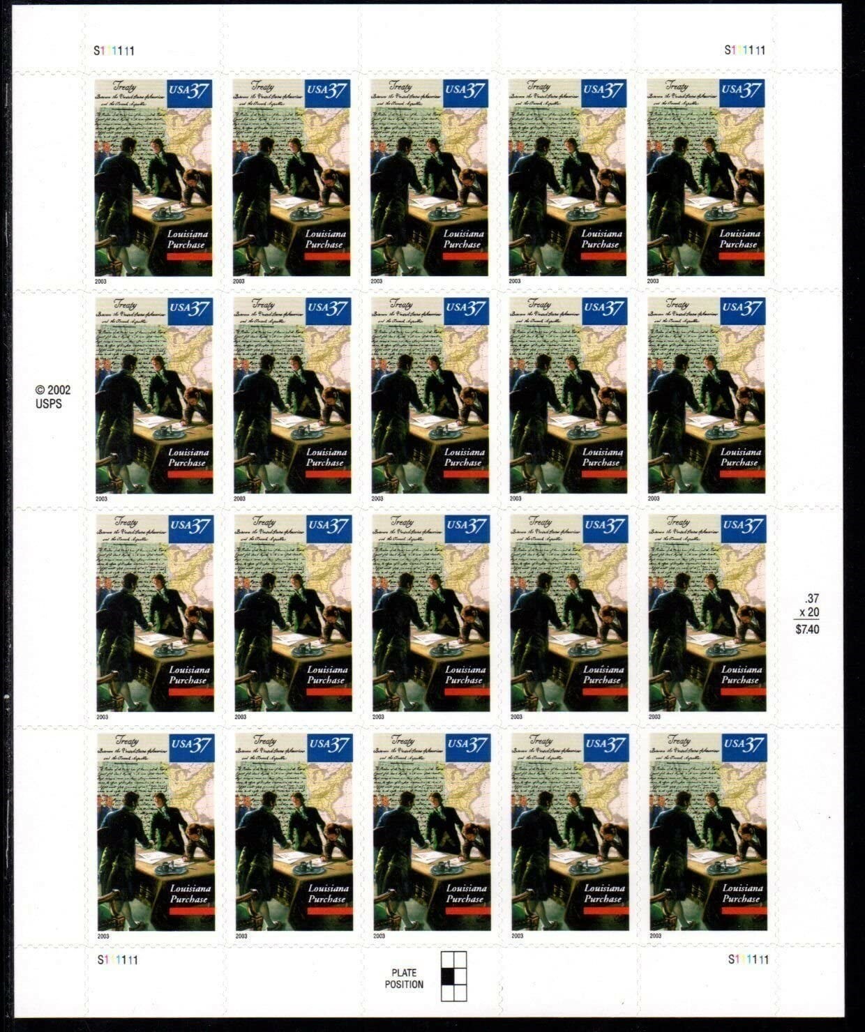 Louisiana Purchase Sheet of Twenty 37 Cent Postage Stamps Scott 3782