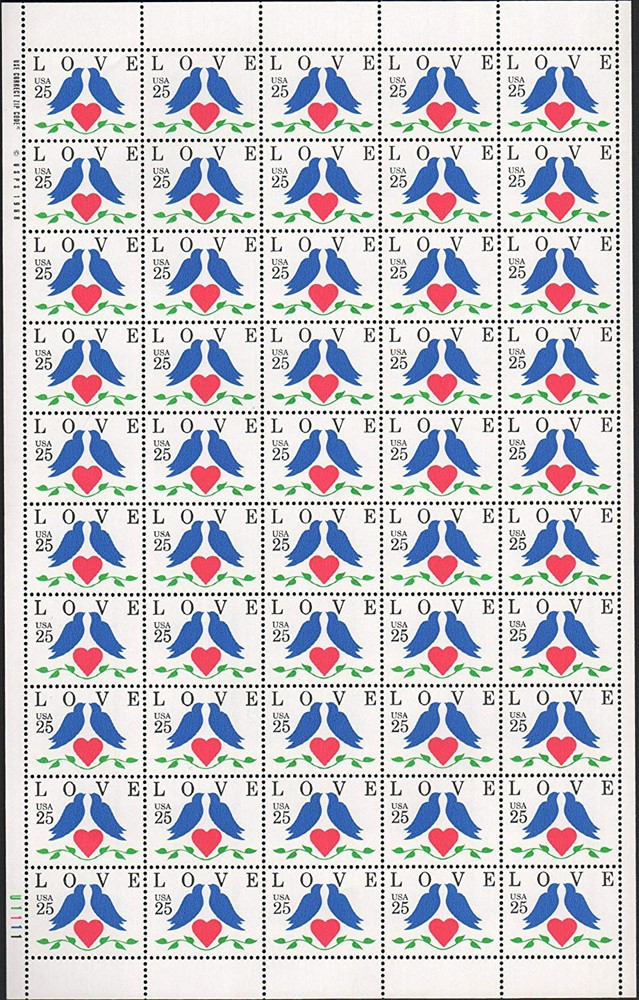 Love Birds Sheet of 50 Stamps - 25 Cent Postage Stamps Scott 2440