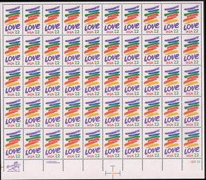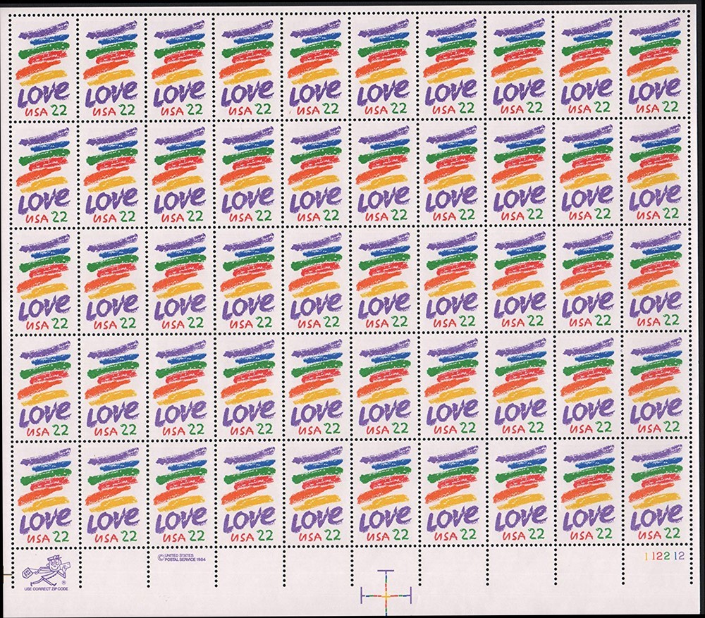 Love Crayon Wedding Sheet of Fifty 22 Cent Postage Stamps Scott 2143