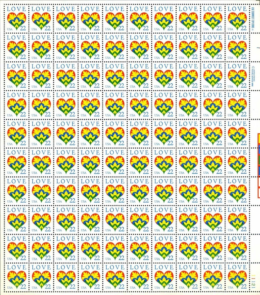 Love Heart 22 Cent Postage Full Sheet of 100 Stamps Scott 2248