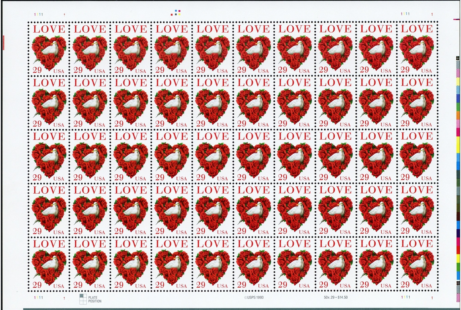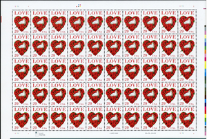 Love Heart With Dove Complete Sheet of Fifty 29 Cent Postage Stamps Scott 2814