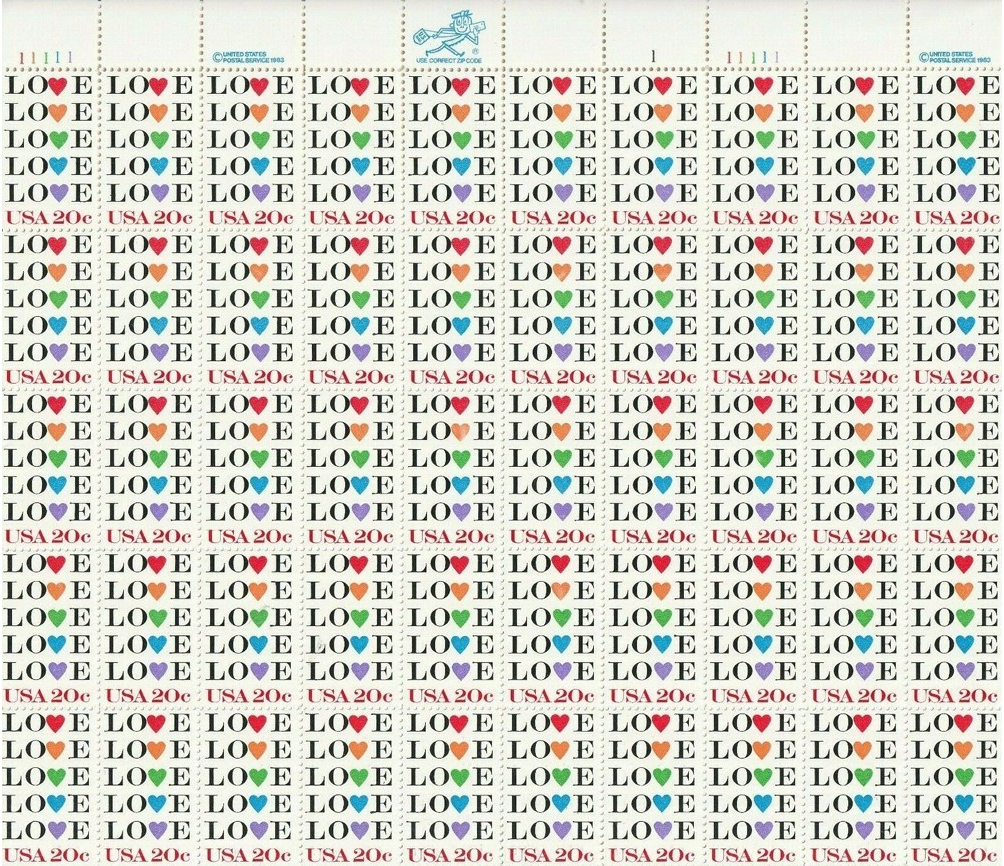 Love Issue Full Sheet of 50 - 20 Cent Postage Stamps Scott 2072
