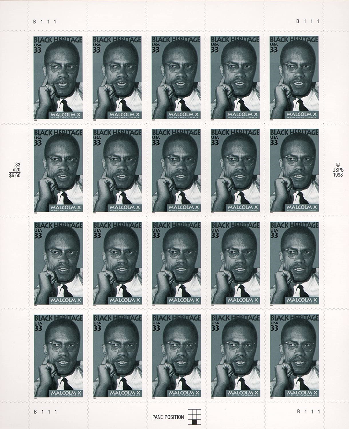 Malcolm X Black Heritage Sheet of Twenty 33 Cent Postage Stamps Scott 3273