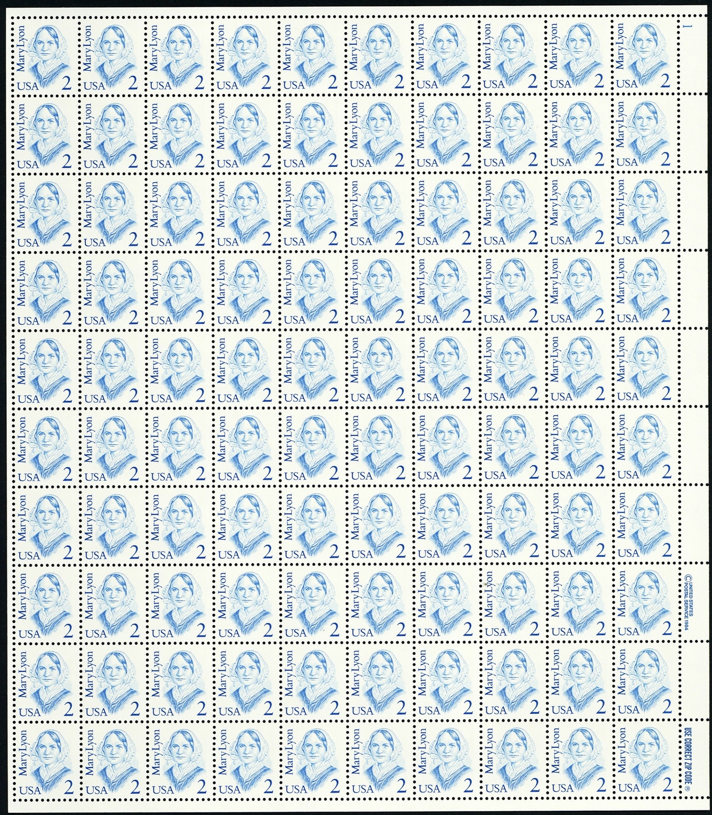 Mary Lyon Sheet of One Hundred 2 Cent Postage Stamps Scott 2169