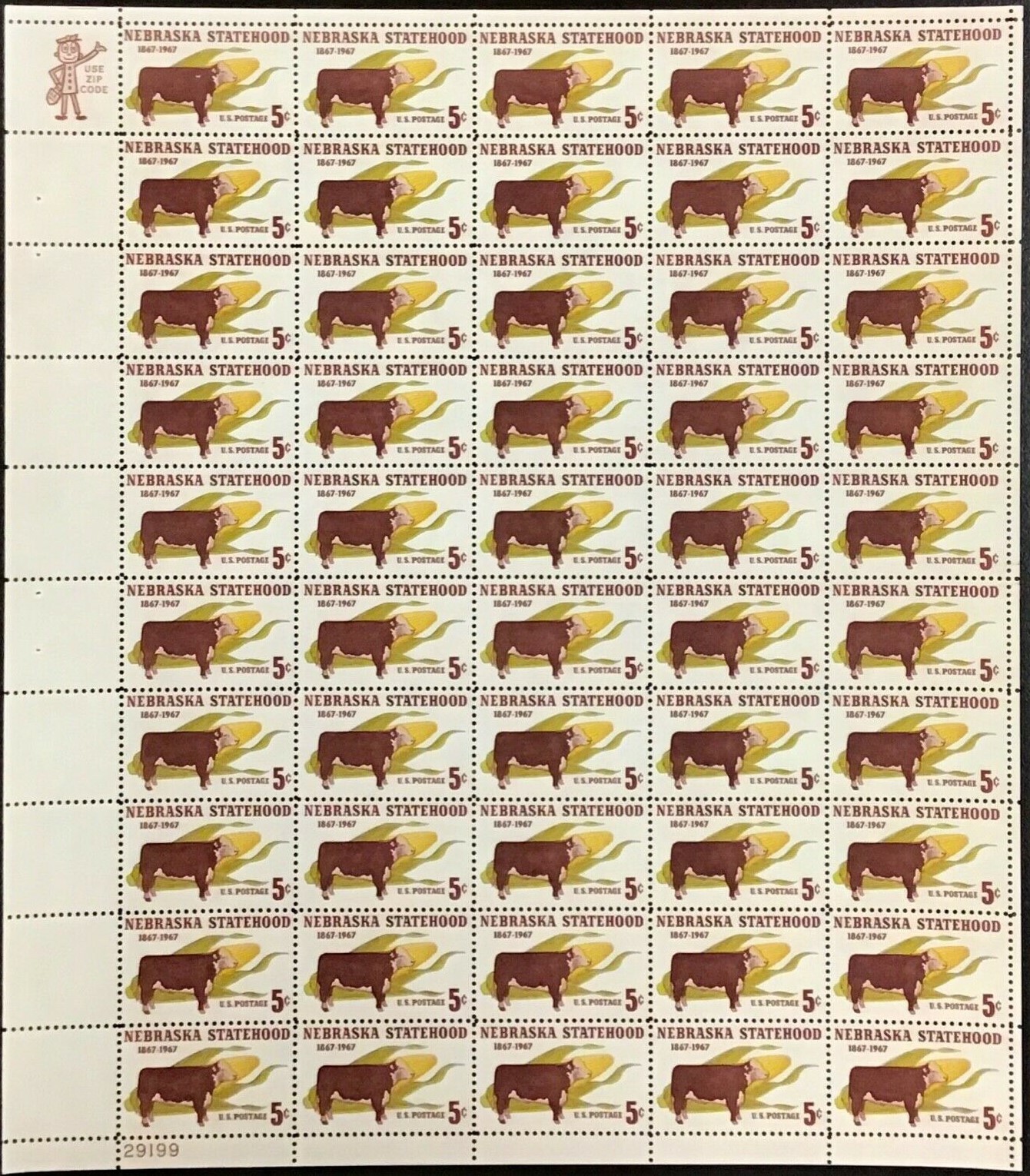 Nebraska Statehood Sheet of Fifty 5 Cent Postage Stamps Scott 1328