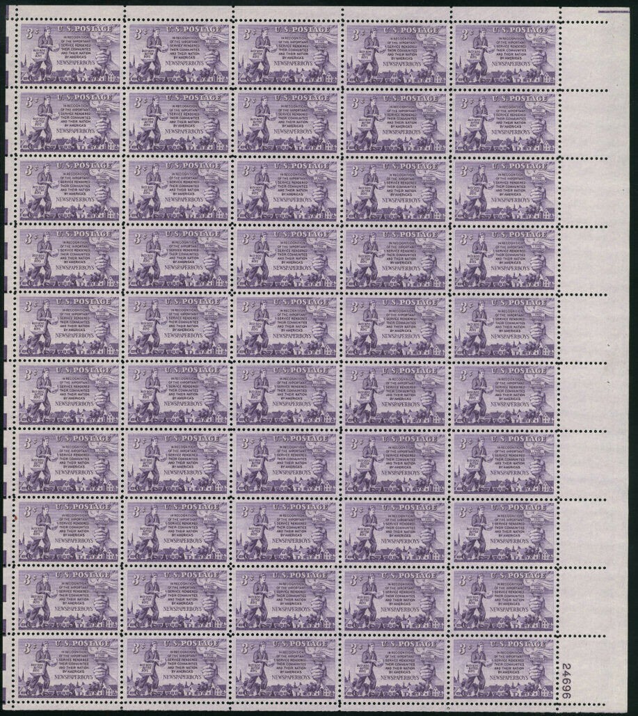 Newspaper Boys Sheet of Fifty 3 Cent Postage Stamps Scott 1015