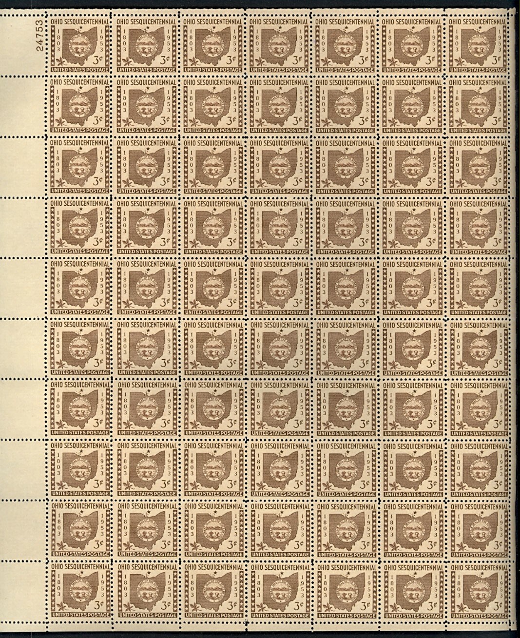 Ohio Statehood Sheet of Seventy 3 Cent Postage Stamps Scott 1018